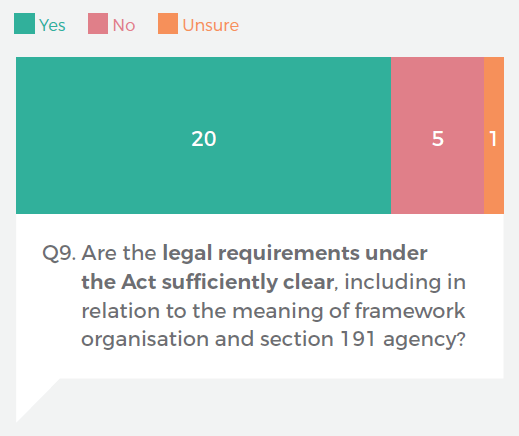 Submission responses that did not consider the Act to be sufficiently clear cited the need for awareness raising and tailored guidance to assist understanding of the Act’s requirements. Submissions also noted that the approach to prescribing framework organisations by reference to funding sources created confusion. This is discussed further below and in Chapter 1.