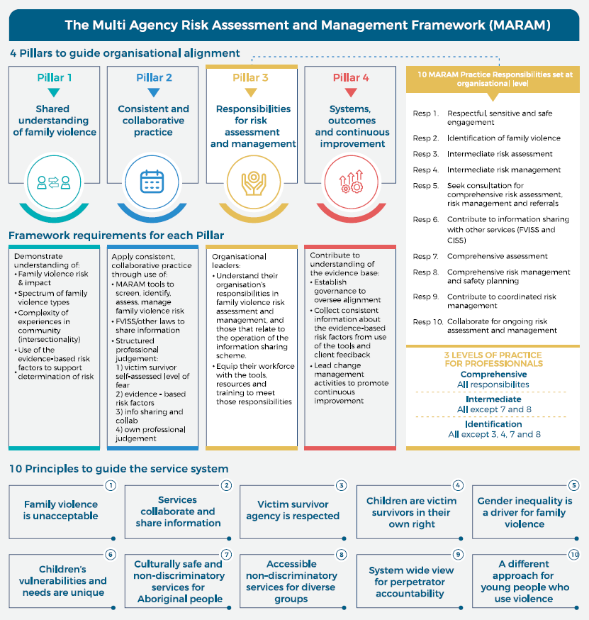 - Victorian Government, Family Violence Multi-Agency Risk Assessment and Management Framework: A Shared Responsibility for Assessing and Managing Family Violence Risk (June 2018). We note that this document describes itself as ‘the MARAM Framework’ notwithstanding that the legal obligation to align relates to the framework as set out in the legislative instrument and not the policy document.