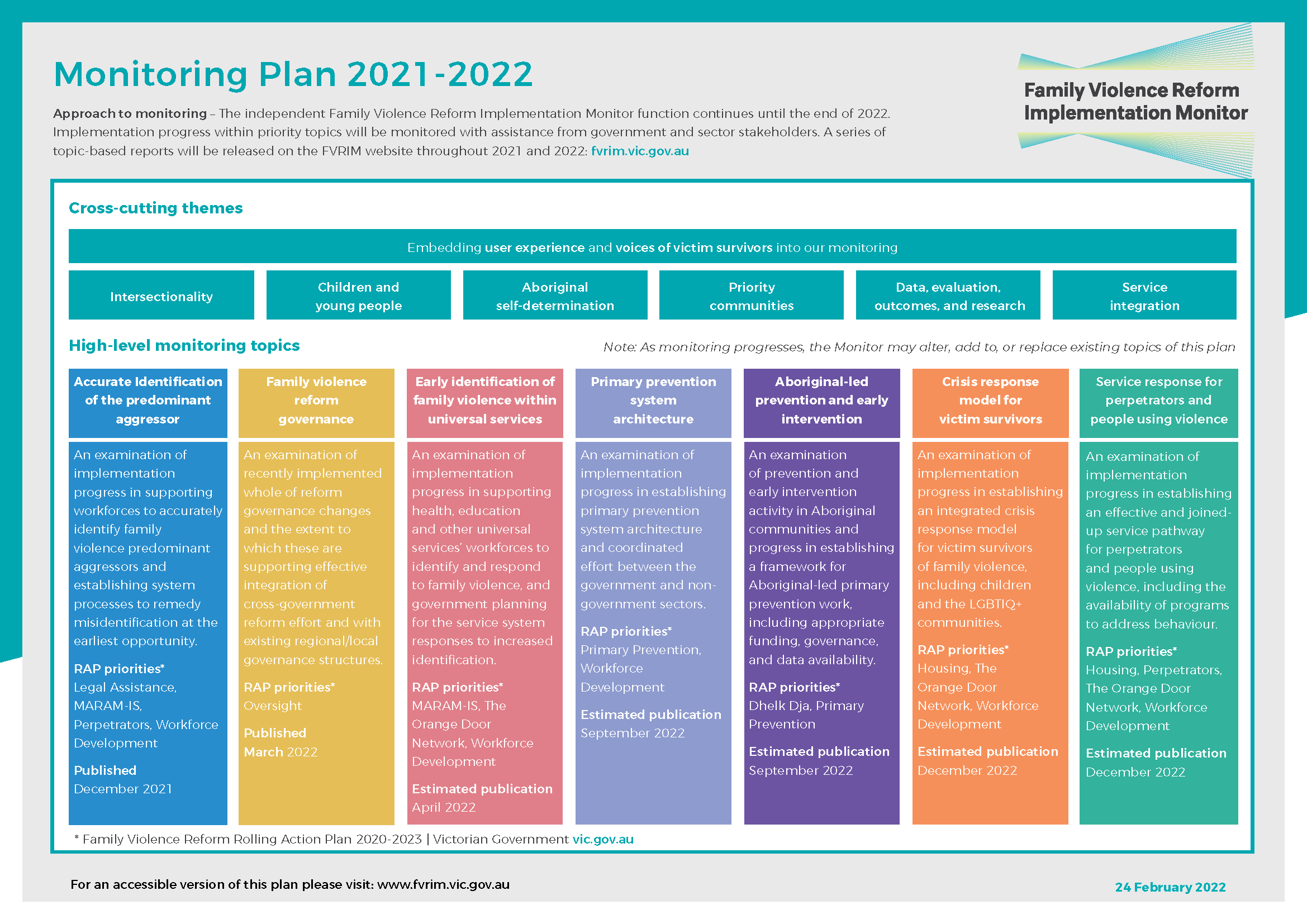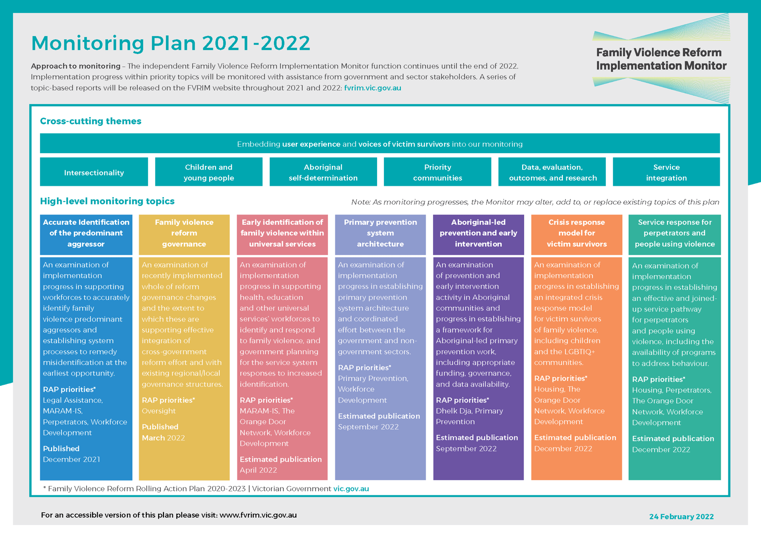 Each monitoring topic has been linked to relevant areas in the Victorian Government’s Family Violence Reform Rolling Action Plan 2020-2023