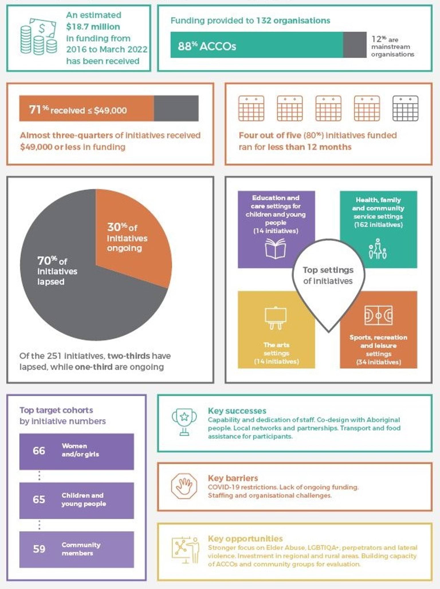 Figure 6 also shows that more than 250 initiatives have been implemented between 2016 and 2021, with estimated funding of $18.7 million,2 the majority of which were funded under the Community Initiatives Fund (199 of the 251 initiatives). At the time of conducting the mapping in March 2022, one-third of the initiatives were still operating while two-thirds had finished.