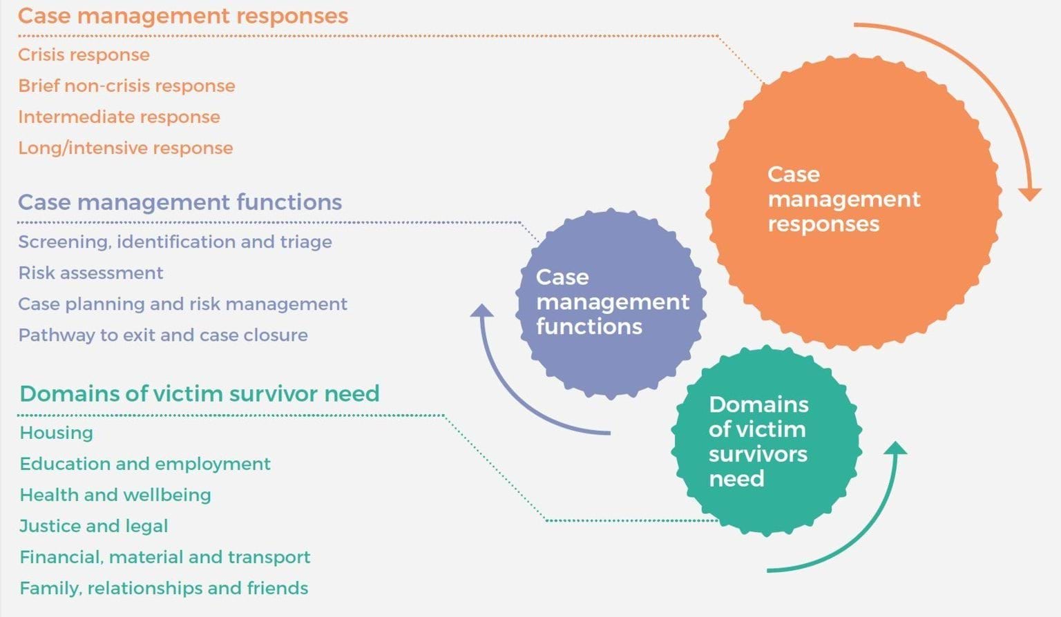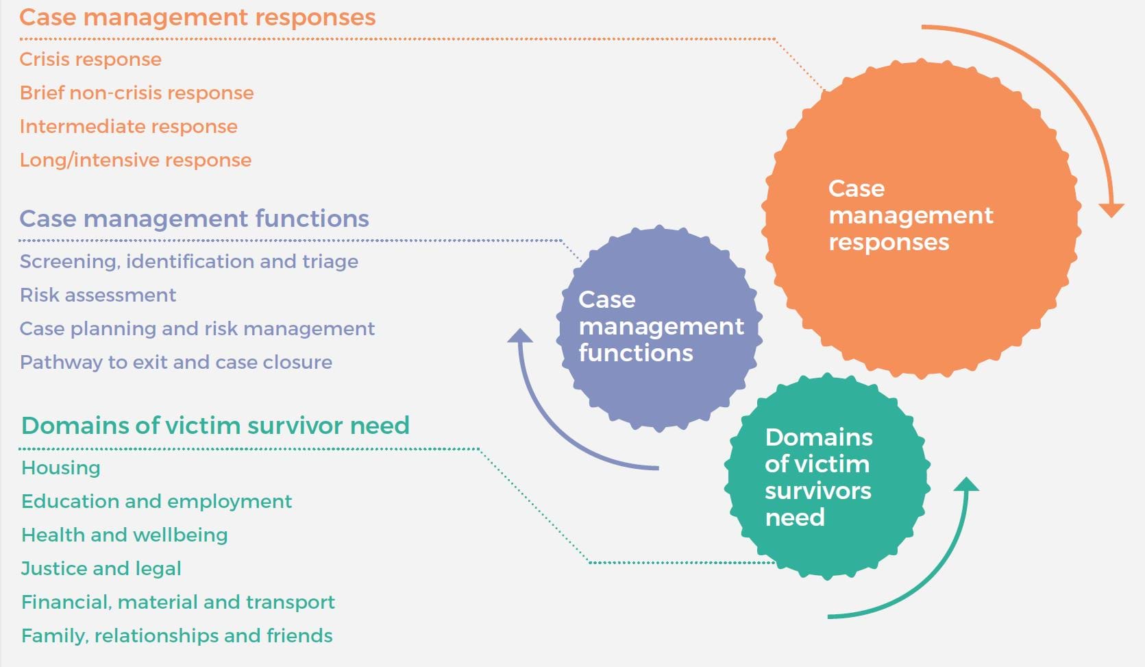 The program requirements clearly outline the types of responses specialist services deliver (from crisis response to a long-term intensive response), the particular functions these services carry out (including risk assessment and case planning) and a series of domains in which victim survivors might need support (including housing and legal). These aspects of case management are outlined in Figure 8.