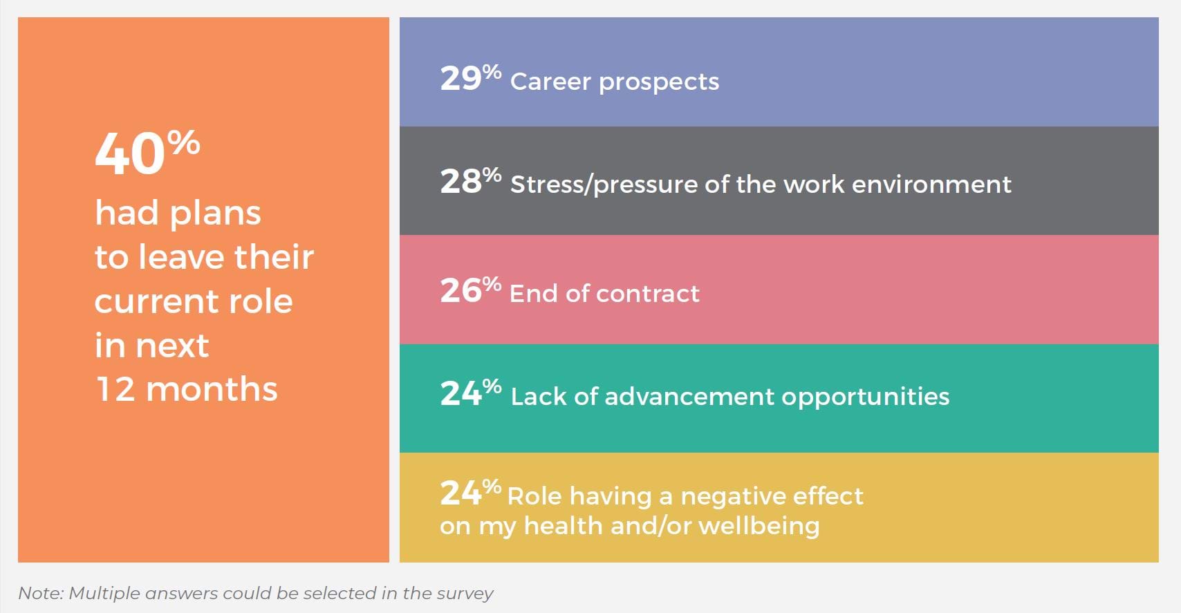 However, even pre-COVID-19, there were substantial workforce challenges requiring attention. For example, the census showed that 40 per cent of respondents had plans to leave their current role in the next 12 months. As shown in Figure 9, a significant proportion of respondents cited issues around stress and negative impacts of work as influencing their desire to leave their current role.