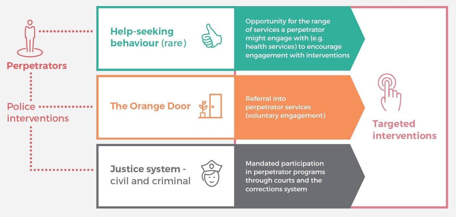 | Men’s behaviour change programs | A psycho-educational group-based program that works with perpetrators to address their use of family violence. |