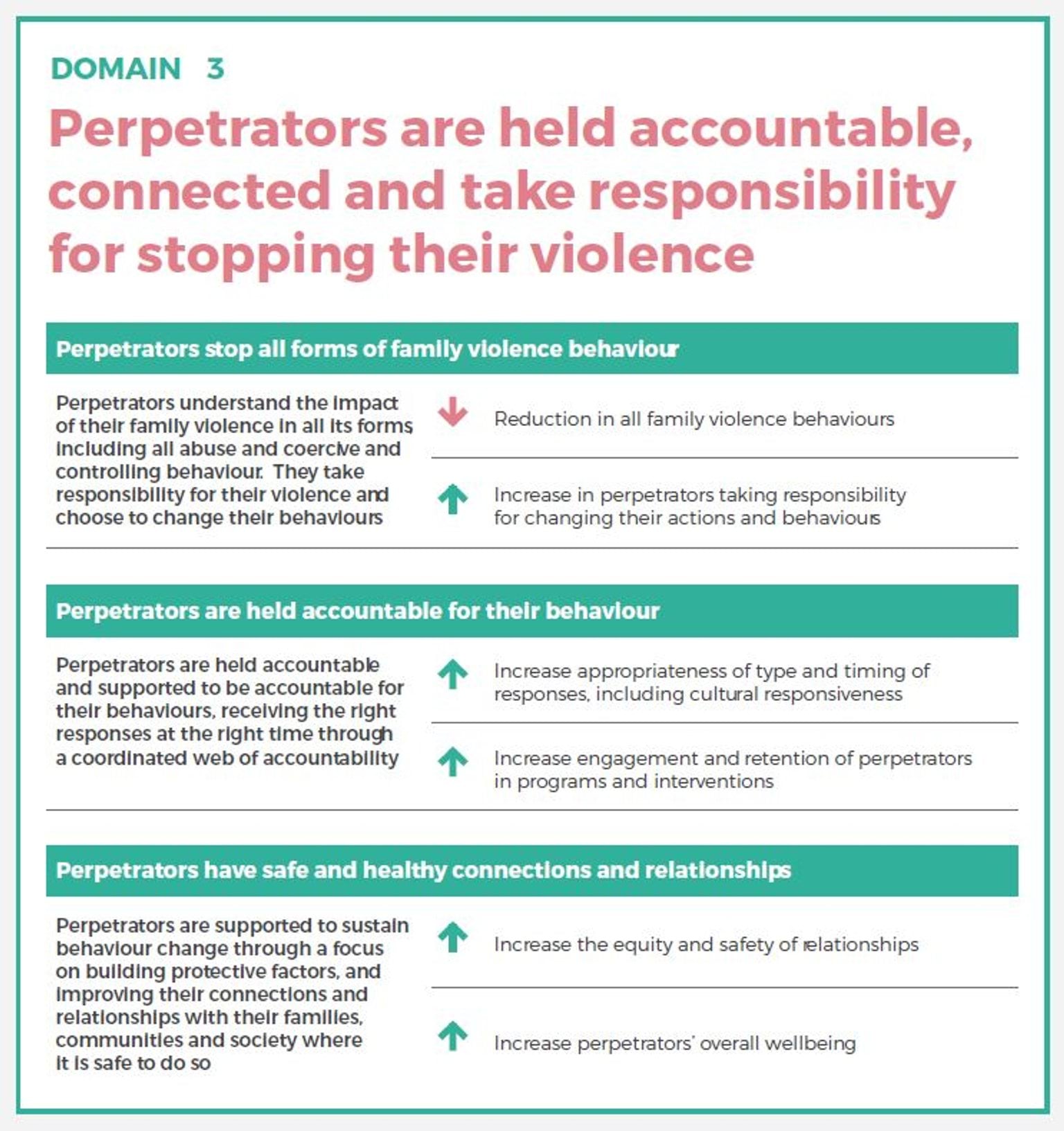 | Perpetrator accountability | Perpetrators being kept in view and facing appropriate and consistent responses to their conduct. |