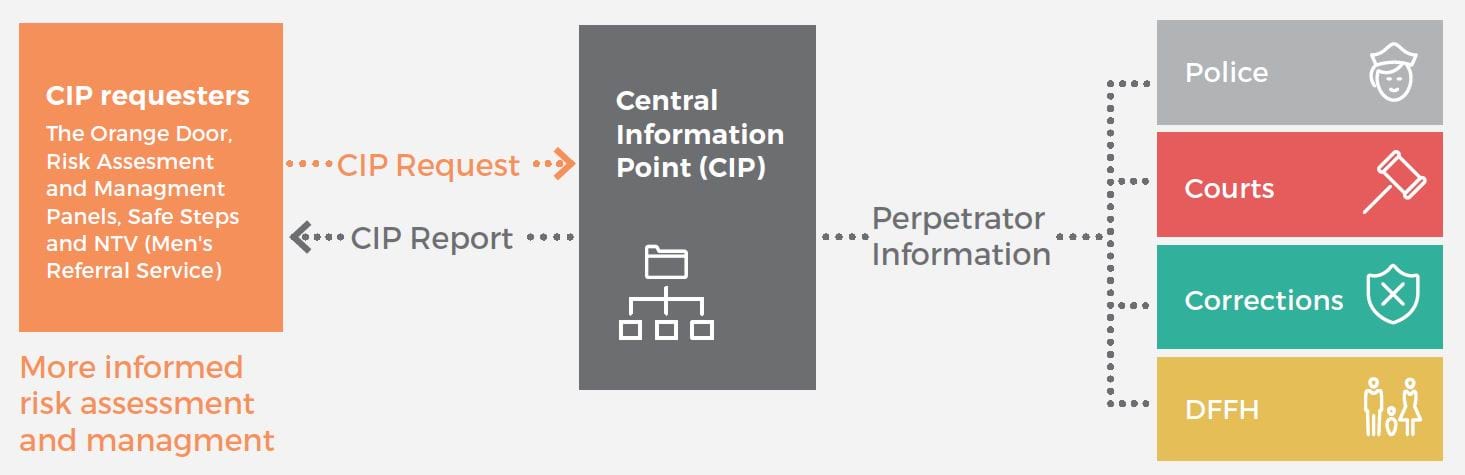 | Central Information Point | Provides timely information to support effective risk assessment and management of perpetrators of family violence. Enabled by the Family Violence Information Sharing Scheme, it brings together representatives from Court Services Victoria, Victoria Police, Corrections Victoria and the Department of Families, Fairness and Housing to consolidate critical information about perpetrators of family violence into a single report. Reports can currently be requested by The Orange Door network and some Risk Assessment and Management Panels. |